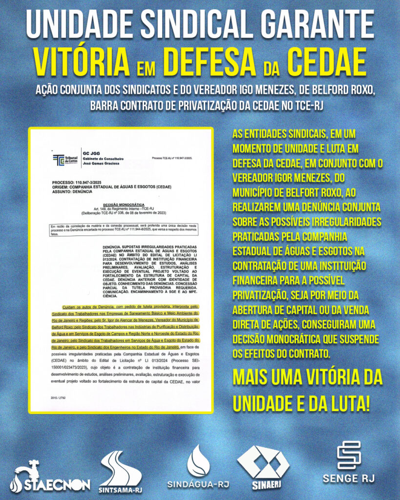 A unidade sindical mostrou sua força — e a luta garantiu mais uma vitória em defesa da CEDAE!Por meio do nosso mandato, junto com os sindicatos, atuamos de forma firme e responsável para barrar, no TCE-RJ, os efeitos do contrato que abria caminho para a privatização da CEDAE. A denúncia conjunta resultou em uma decisão […]